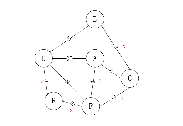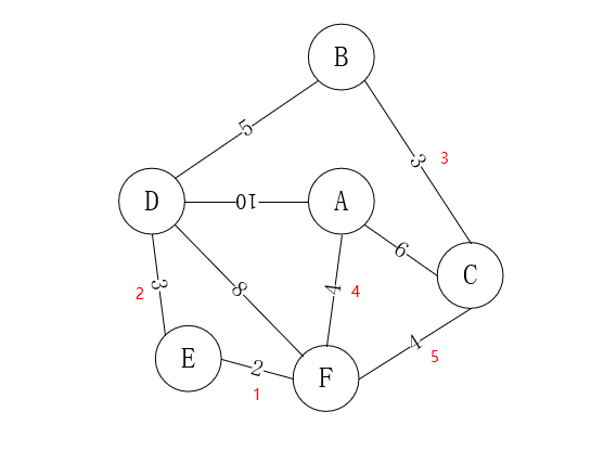 举例: 假设以A为第一个点,我们依次被连接的顶点顺序为:A->F->E->D->C->B,边被选择的顺序为:4、2、3、4、3。步骤为红色12345的顺序。