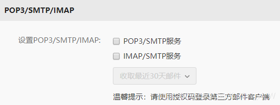 - 选择POP3/SMTP/IMAP:开启如下两条服务,并注意到这里提示使用的是授权码登录第三方客户端,而非邮箱密码(有些邮箱使用的是密码而非授权码)。